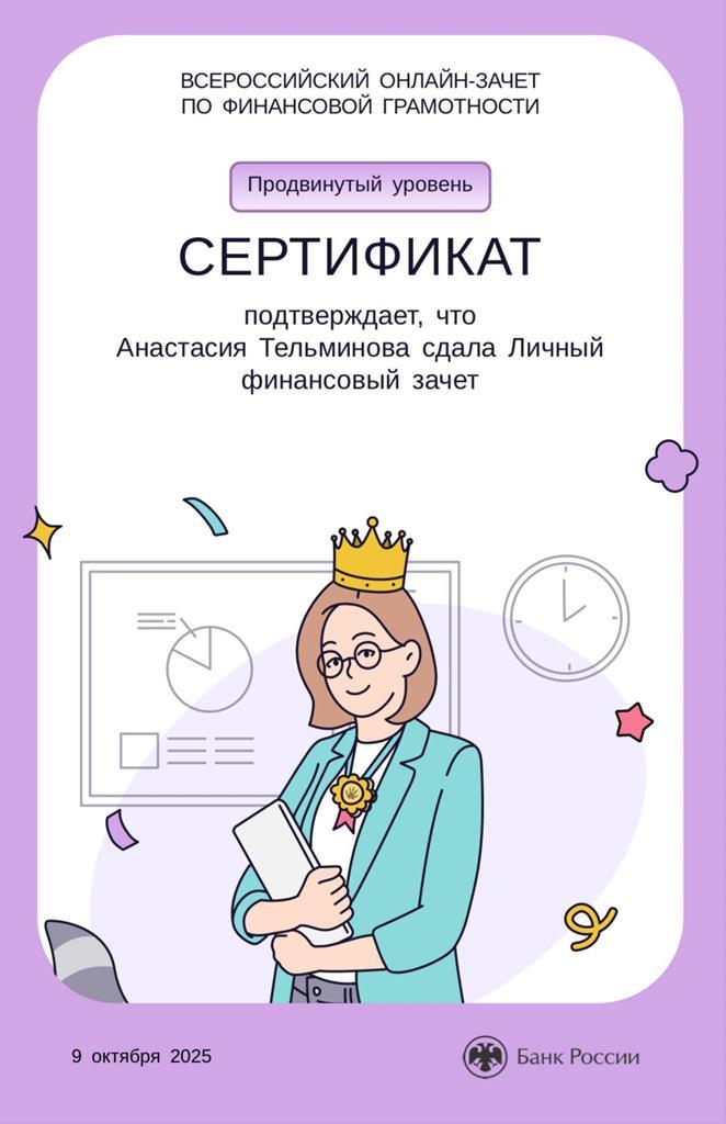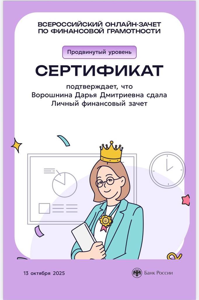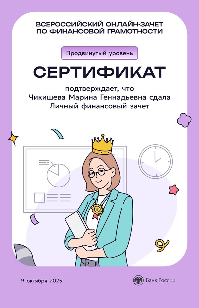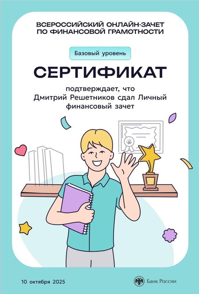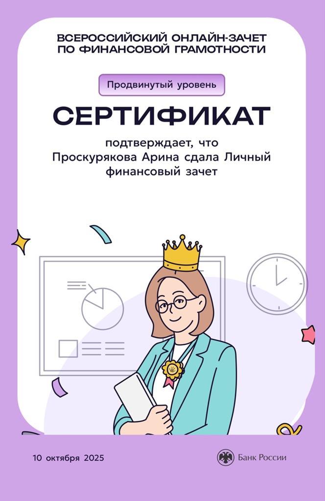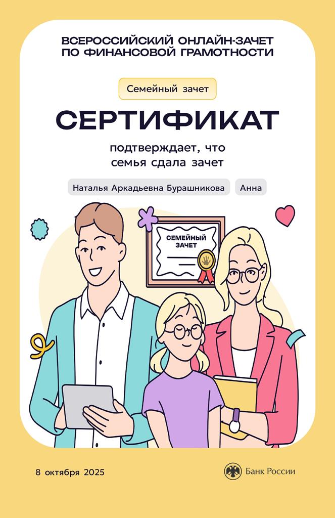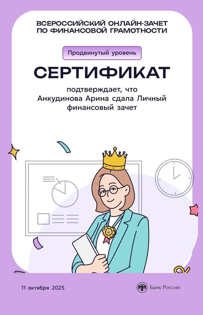 Участники, которые успешно справились с зачётом, получили именные сертификаты. А также обучающиеся не только проверили свои знания, но и получили ценные индивидуальные рекомендации для восполнения пробелов, сделав важный шаг к повышению личной финансовой компетентности.