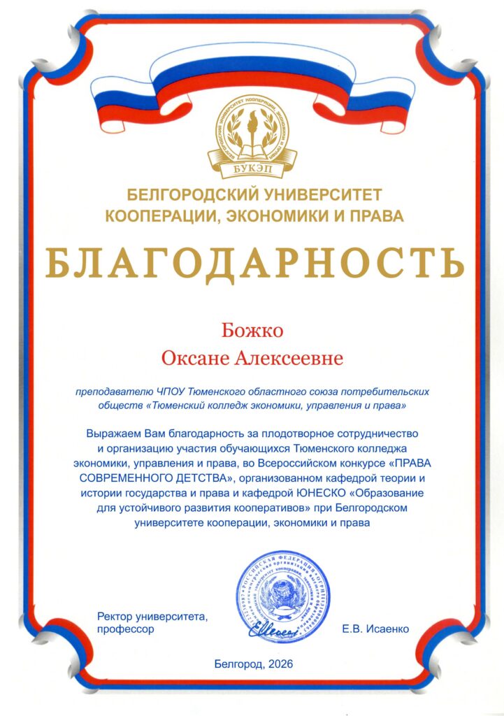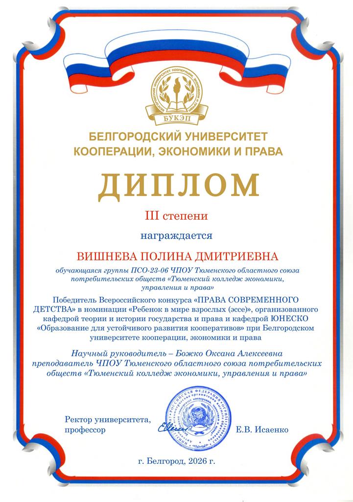 10 февраля в Белгородском университете кооперации, экономики и права кафедрой теории и истории государства и права и кафедрой ЮНЕСКО «Образование для устойчивого развития кооперативов» при БУКЭП подведены итоги и награждены победители Всероссийского конкурса работ «ПРАВА СОВРЕМЕННОГО ДЕТСТВА».