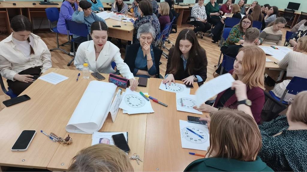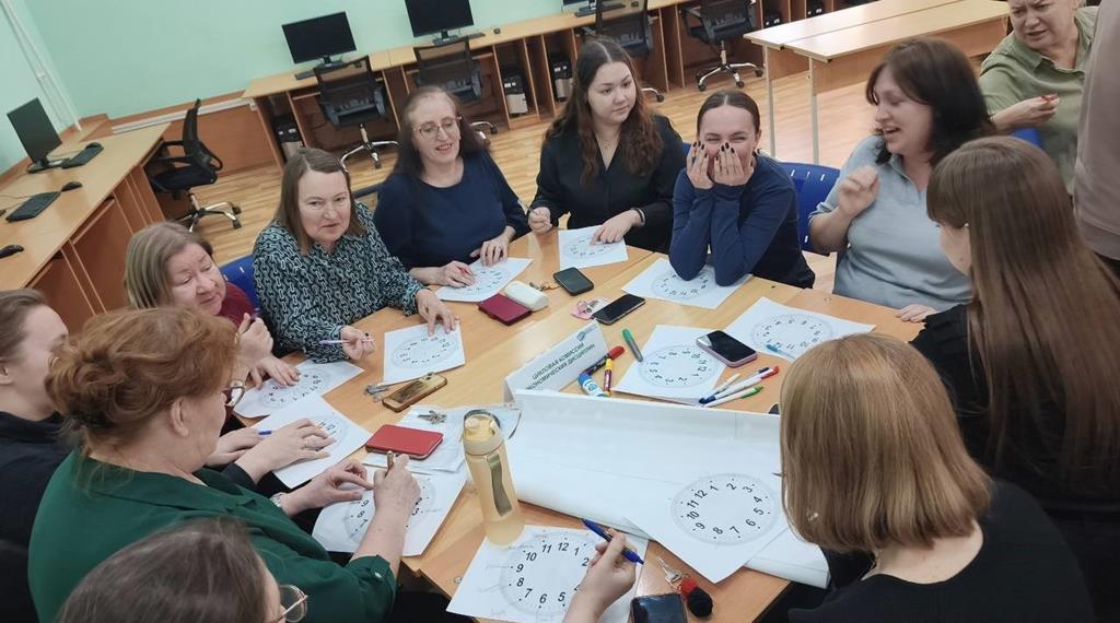 Центральным элементом интенсива стало интерактивное упражнение «Часы», направленное на глубокий анализ аспектов формирования профессиональной культуры. Преподаватели, перемещаясь по «стрелкам», последовательно обсуждали каждый аспект в парах, фиксируя идеи и спорные моменты.