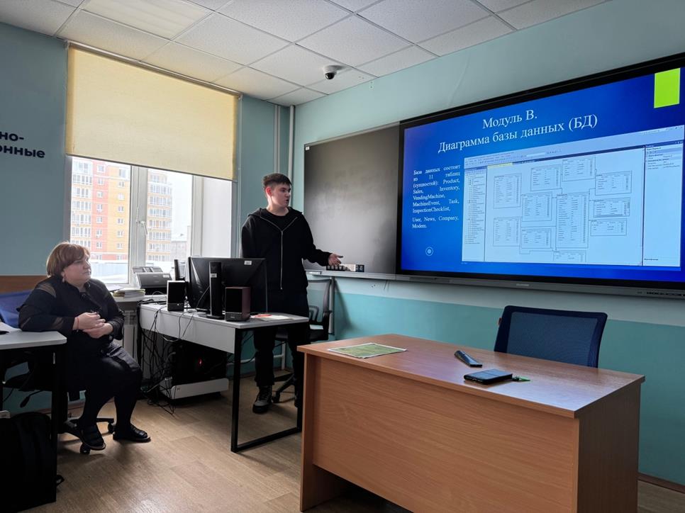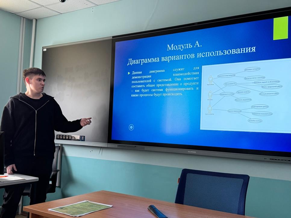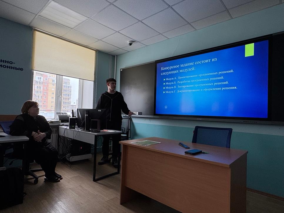 В этом году колледж представит Гайсин Евгений (ИП-24-26б). На тренировке он рассказал о конкурсных заданиях в разных модулях и продемонстрировал презентацию, что также является элементом Модуля Г Документирование и оформление решения.