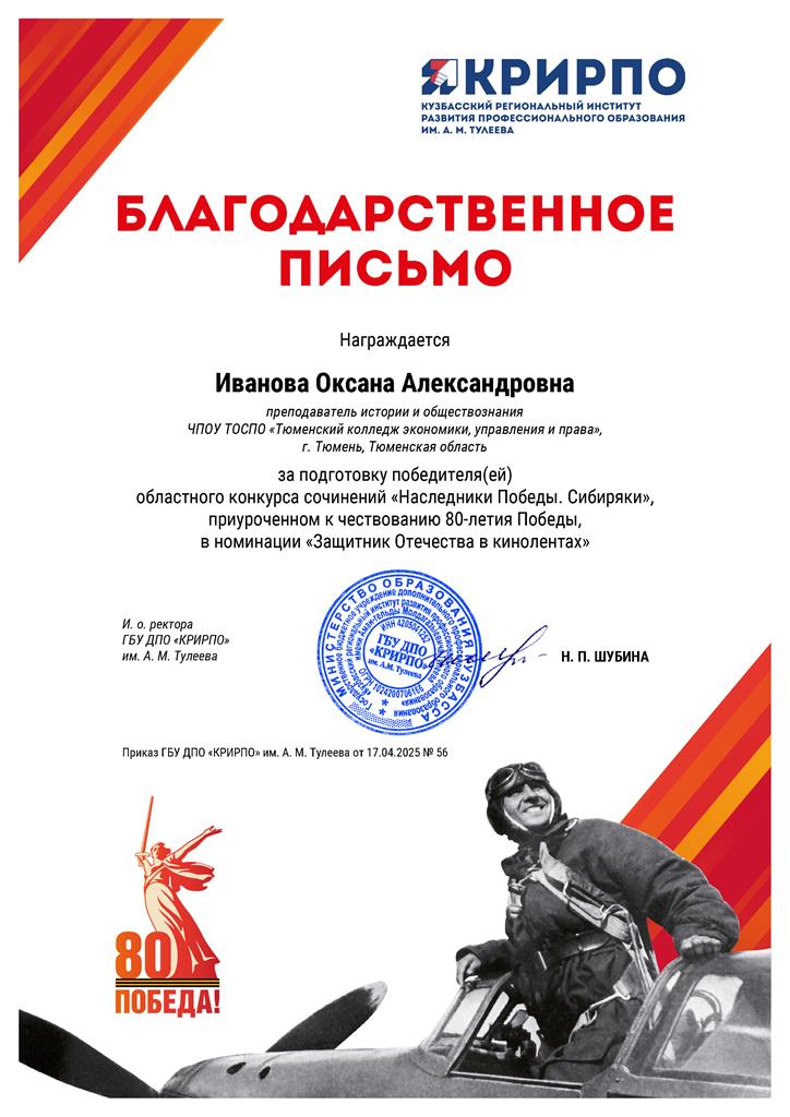 Преподавателям Ивановой Оксане Александровне и Зайцевой Юлии Андреевне от организаторов конкурса направлены благодарственные письма.