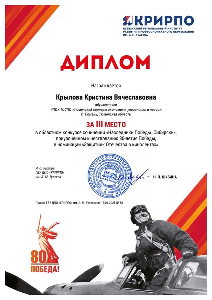 Конкурс сочинений «Наследники Победы. Сибиряки» проводился с 3 февраля по 21 марта 2025 года в рамках празднования 80-летия Победы в Великой Отечественной войне и проводимого в Российской Федерации в 2025 году Года защитника Отечества. Организатором конкурса выступил Кузбасский региональный институт развития профессионального образования имени А.М. Тулеева, г. Кемерово.