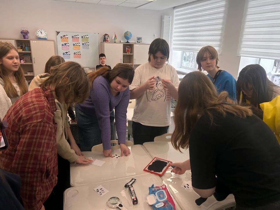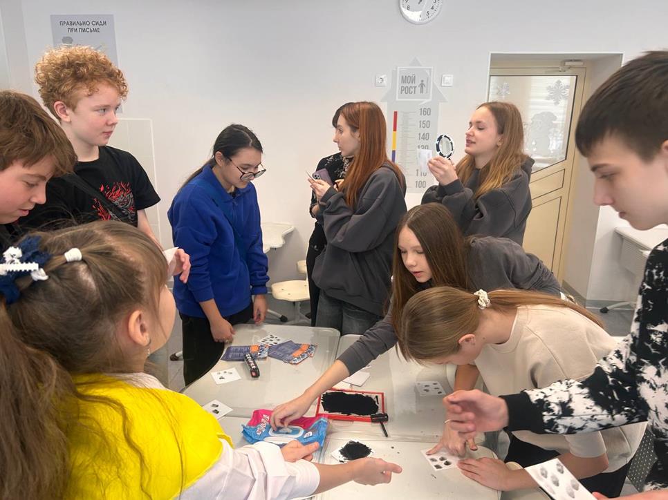 Ребята познакомились с работой эксперта-криминалиста: решали криминалистические ситуации, изучали состав криминалистического чемодана и типы папиллярных узоров, с неподдельным интересом снимали собственные отпечатки пальцев рук и определяли тип узора.